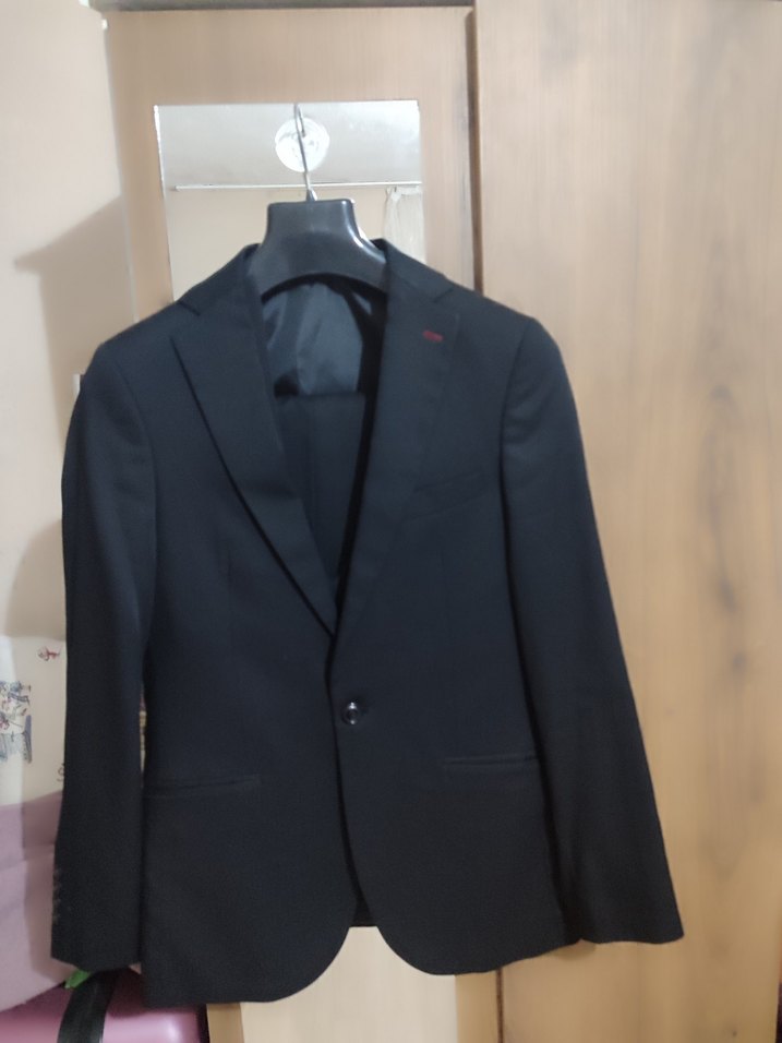 Erkek takım elbise, siyah renkte, çentikli yaka ve düğmeli detaylara sahip. Uzun kollu, normal boyda ve modern klasik tarzda, ofise uygun.
