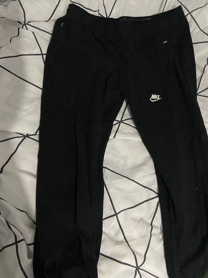 Dar kesim siyah Nike eşofman altı, fermuarlı cepler ve sentetik kumaşla trendy sokak stili için uygun.