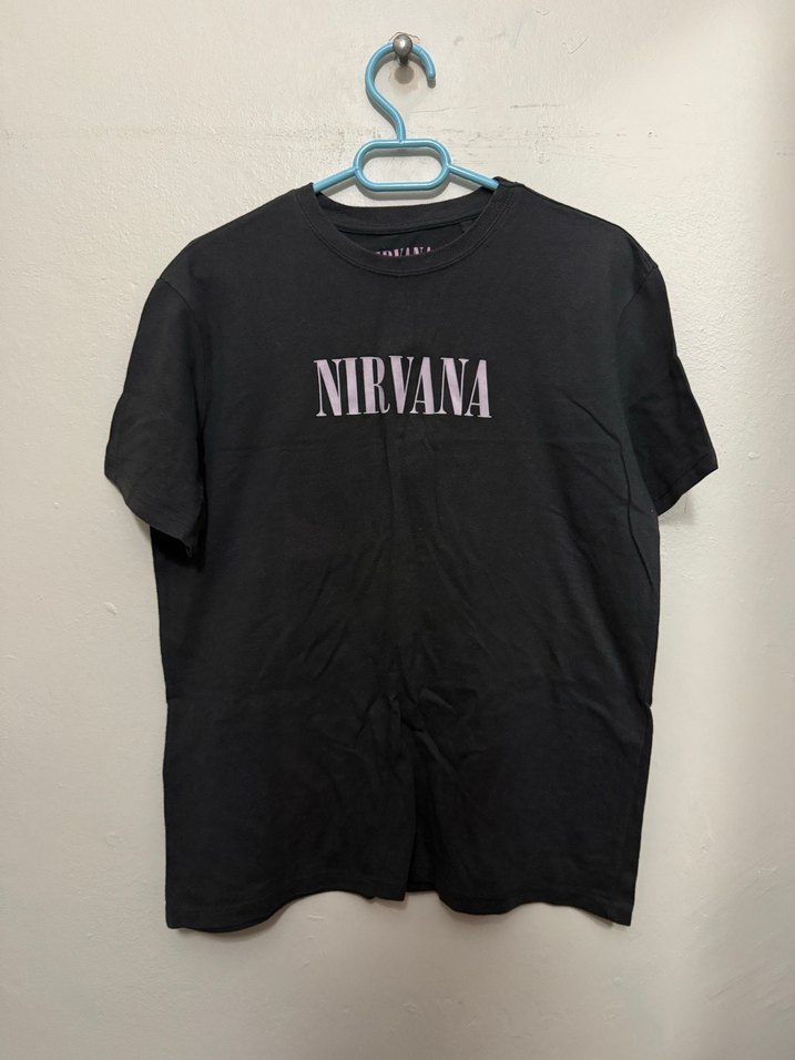 Erkek siyah pamuk tişört, bol kesim, kısa kollu ve bisiklet yaka. "Nirvana" baskılı, grunge punk sokak stili ve günlük kullanım için rahat şıklık sunar.