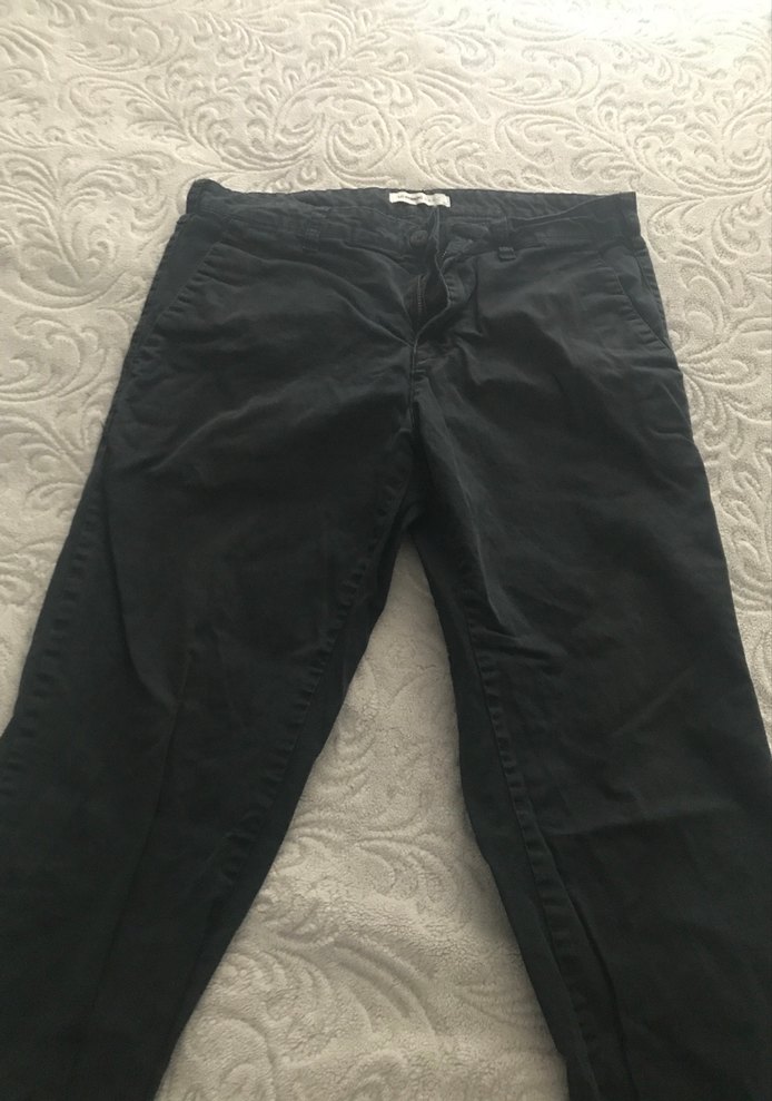 Düz siyah renkli, normal boyda, dar kesim denim pantolon. Rahat ve şık günlük dış mekan kullanımı için uygundur.