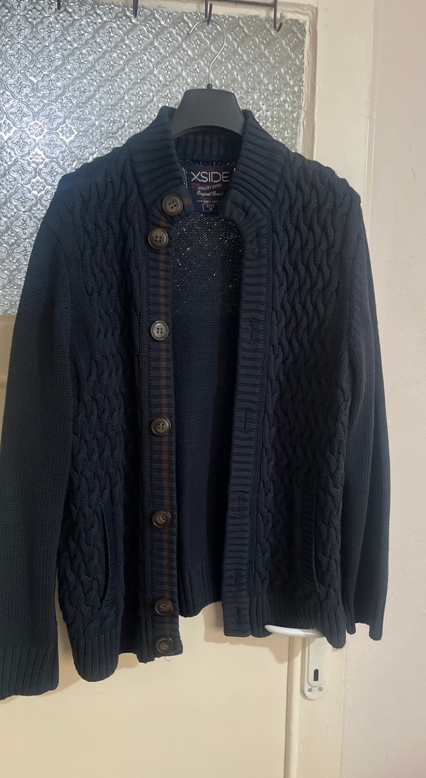 Erkek siyah örgü yün hırka, notlu yakalı ve uzun kolludur. Rahat kesimi ve midi boyu günlük kullanım için uygundur.