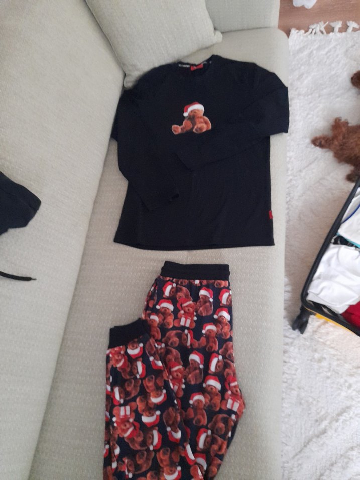 Erkekler için siyah örme uzun kollu, ayı desenli üst ve baskılı midi boy pantolonlu, rahat ve bol kesim pijama takımı.marka burda yok oyuzden marka temsilidir
