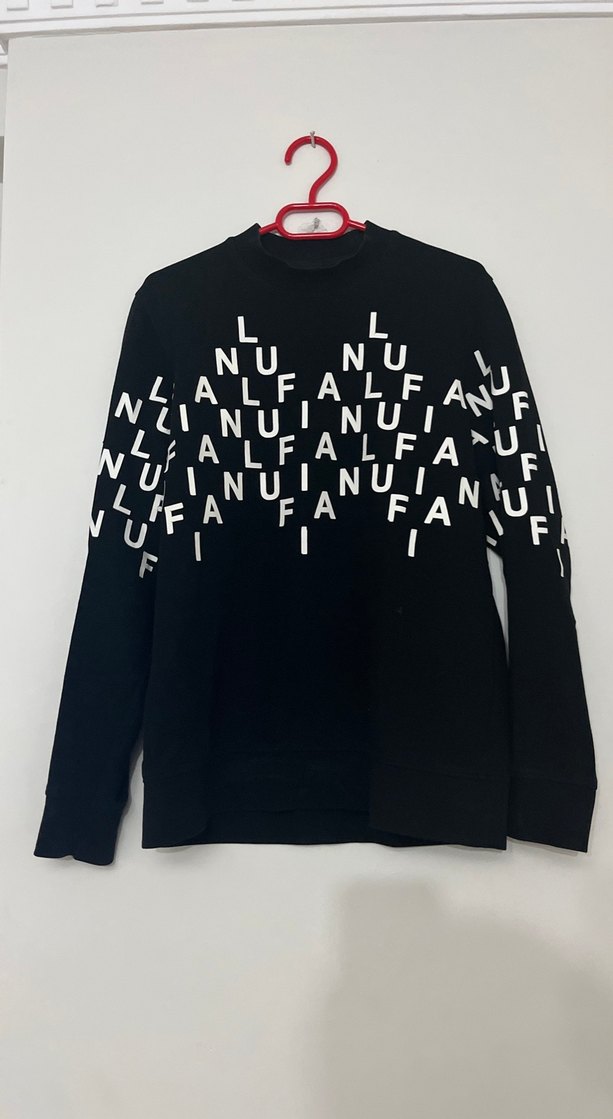 Uzun kollu, bisiklet yaka, siyah erkek sweatshirt. Örme kumaştan ve bol kesim. Göğüs ve kollarda beyaz harf baskısı bulunur. Günlük kullanım için uygundur.