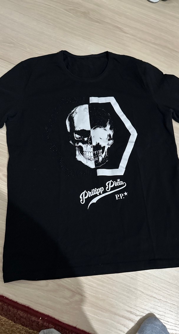 Siyah pamuklu, kısa kollu, bisiklet yaka ve baskılı kafatası deseni ile Philipp Plein markalı, fitted kesim erkek tişörtü. Rock punk tarzına uygun. Önünde kurukafa olan yeşil hiç giyilmedi sadece etiketi kesilirken kesildiği için ufaktan bir örme işlemi yapıldı kırmızı renk  ve mavi renk olan hiç giyiilmiş değil hepsi tek fiyat