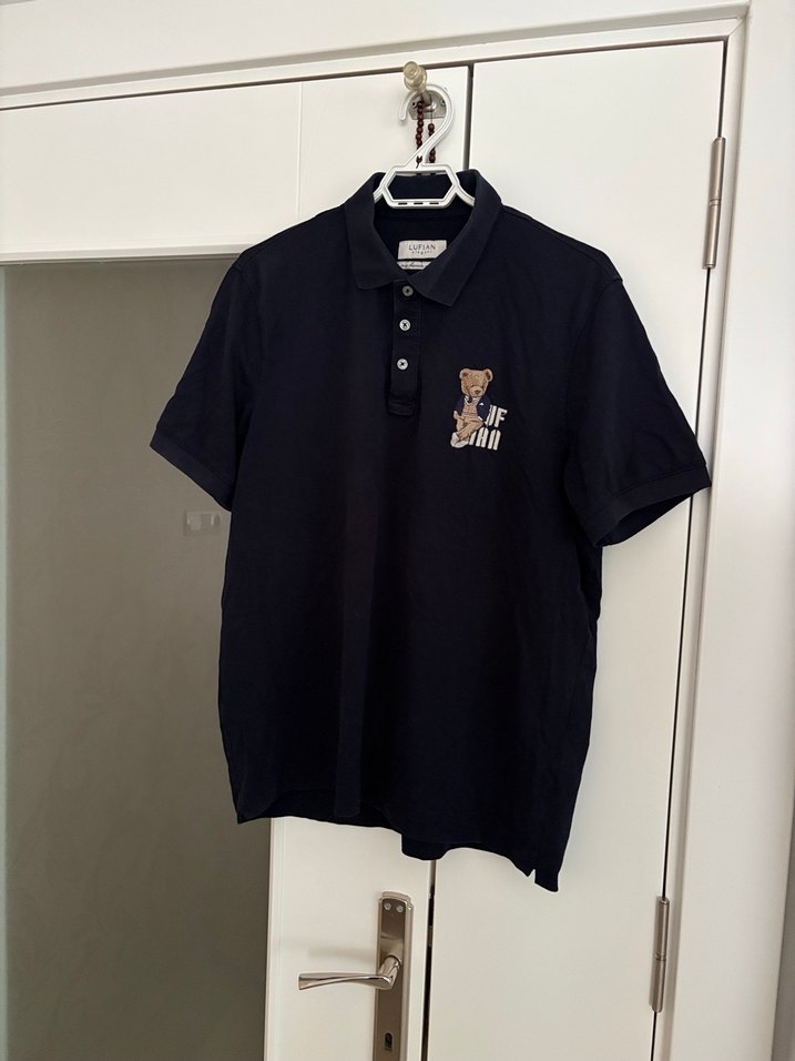 Siyah pamuklu, kısa kollu, düğmeli polo tişört. Yakalı, baskılı ayıcık desenli, bol kesim ve normal boyda, günlük rahat stil için uygundur.