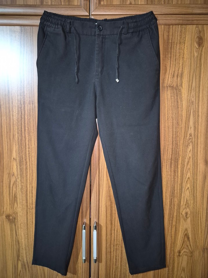 Erkekler için siyah pantolon, normal kesim. Elastik bel ve bağcıklarla rahat, günlük kullanıma uygun şık bir model.