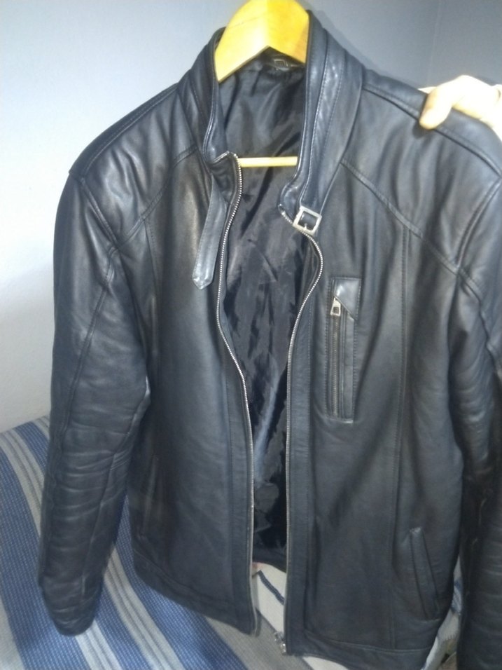 Siyah parlak deri biker ceket, çıtçıtlı yakalı, fermuarlı ve regular kesim. Askılı kollu, midi boyda, günlük kullanıma uygun.