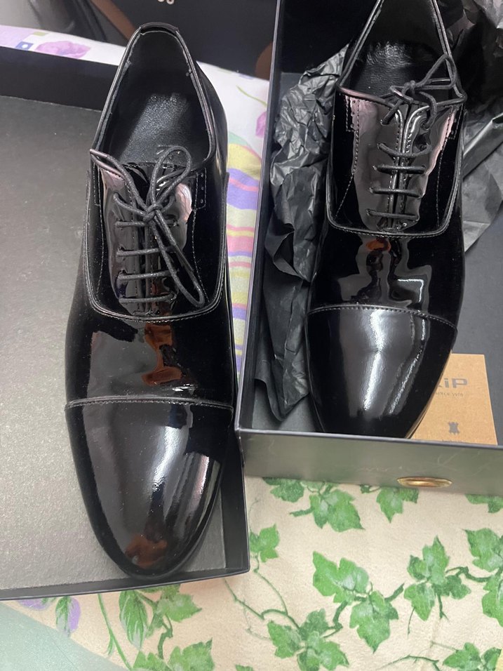 Siyah parlak yüzeye sahip, yılan desenli erkek klasik ayakkabılar. Dayanıklı kauçuk malzemeden üretilmiş, ofis ve iş stiline uygun, modaya uygun gotik dokunuş içerir.