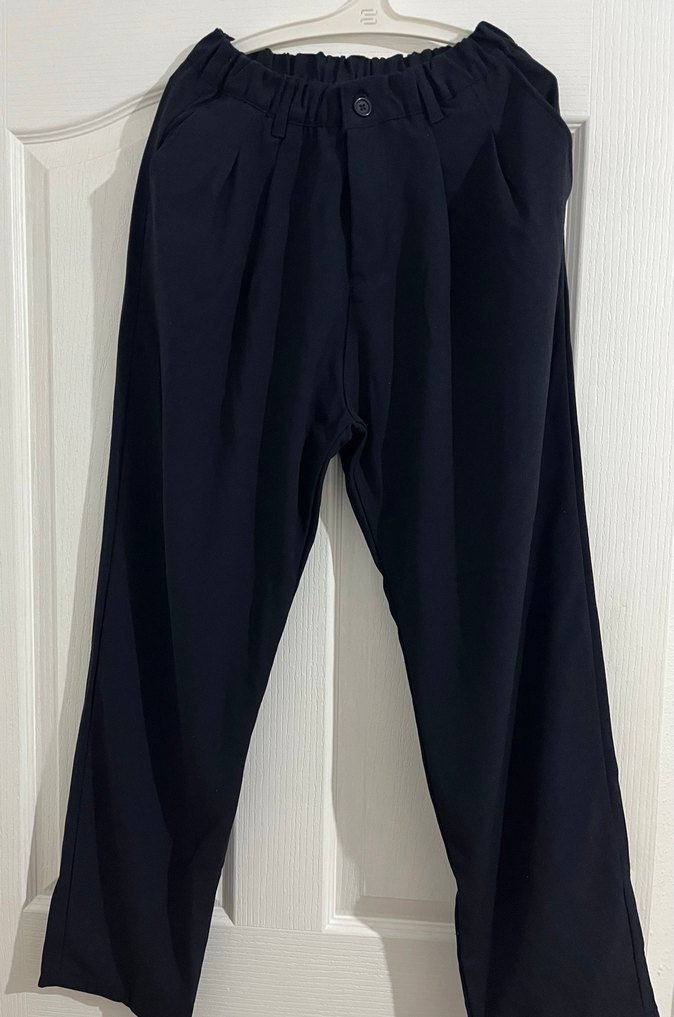 Erkekler için siyah kumaş pantolon, salaş kesim ve pilili detaylara sahip. Midi boyda, sentetik yumuşak kumaştan, sade ve şık günlük kullanıma uygun.