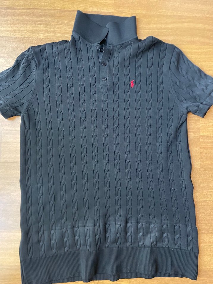 Hiç kullanılmadı Erkekler için siyah örgü dokulu, kısa kollu, yakalı polo tişört. Fitted kesim ve normal boyda, gündelik sokak stiline uygun.