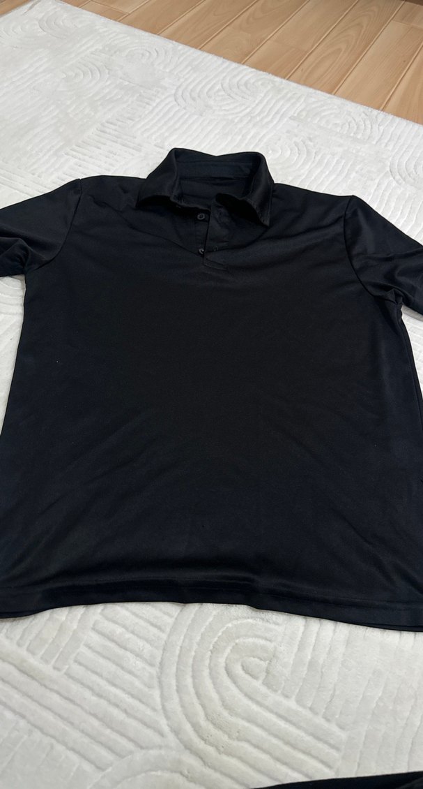 Düz siyah renkli, polo yakalı ve kısa kollu erkek tişörtü. Düzgün sentetik kumaştan, vücuda oturan kesime sahip, sade ve şık görünümlü.