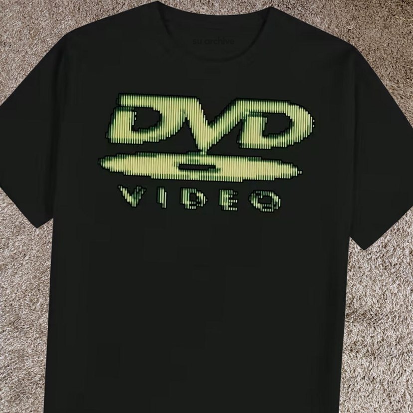 Siyah renkli, bol kesim erkek tişörtü. Kısa kollu, yuvarlak yaka, parlak "DVD VIDEO" baskılı ve cırt cırt detaylı