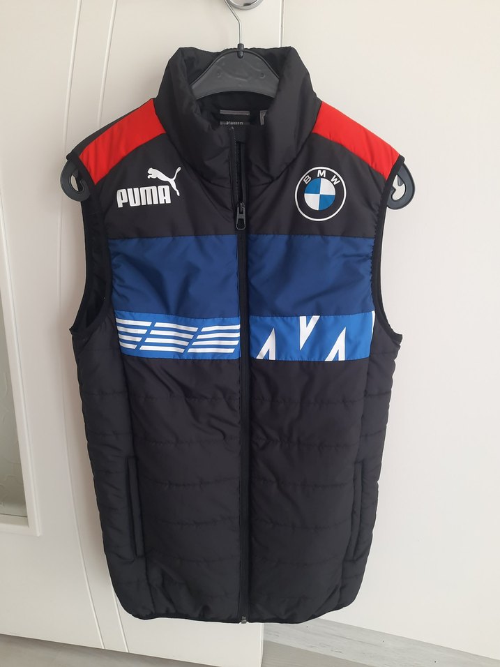 Fermuarlı, bisiklet yaka erkek yelek. Yumuşak ve sıcak kumaştan, siyah üzerine mavi ve kırmızı baskılı detaylar, Puma ve BMW logolu.