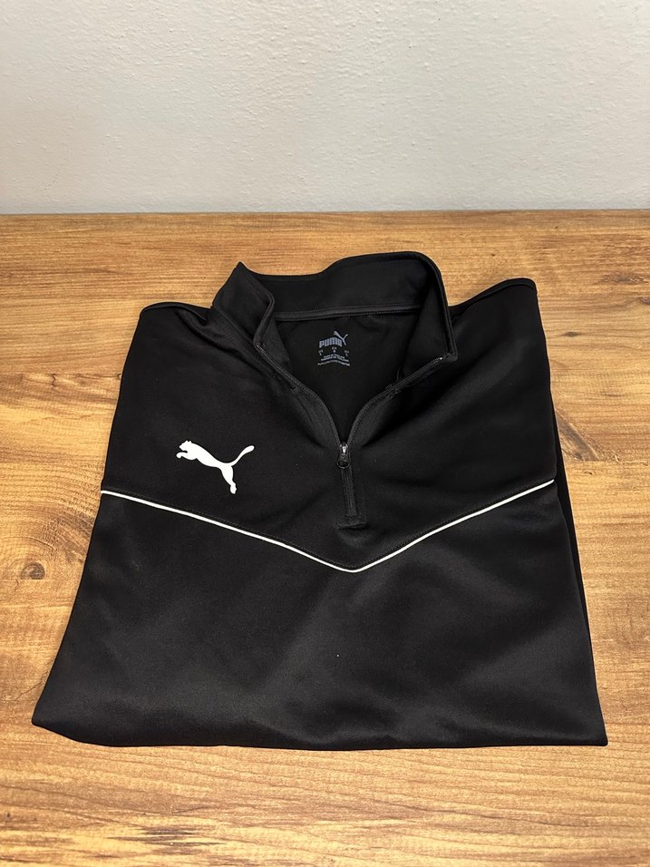 Erkekler için siyah, yarım fermuarlı, uzun kollu, yüksek yakalı ve rahat kesime sahip sıcak tutan kumaştan sweatshirt. Parlak Puma baskılı, spor ve günlük tarz için uygundur. ♂️