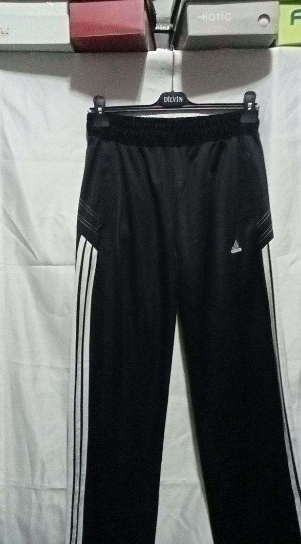 erkek için siyah, bol kesim midi boy eşofman. Sentetik kumaştan, beyaz yan çizgilerle spor ve sokak tarzı için uygun.