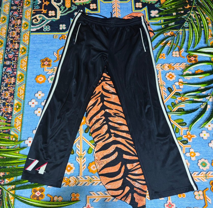 Erkek için rahat kesim, fermuarlı cepli, yanları ince çizgili, koyu renkli ve sentetik kumaştan eşofman altı.