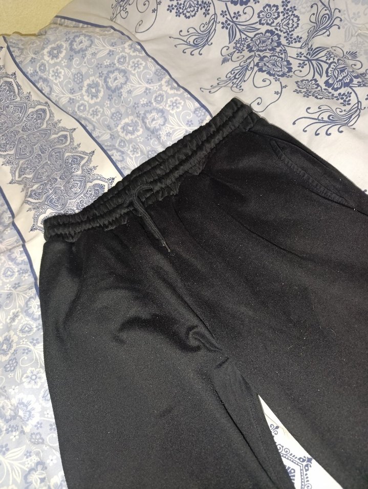 Erkek siyah eşofman, rahat kesim, fermuarlı cepler ve normal boyda, yumuşak sentetik kumaştan günlük kullanıma uygun.