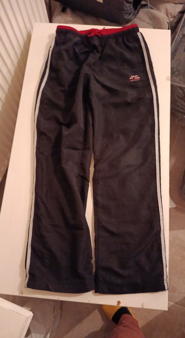 Siyah, rahat kesim erkek eşofman altı, fermuarlı cepler ve yan çizgilerle sokak tarzı sunar. Sentetik, yumuşak kumaştan yapılmıştır.