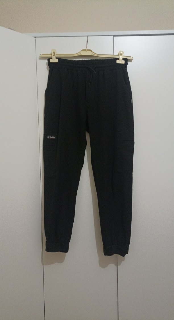 Siyah, rahat kesim, midi boy erkek eşofman. Yumuşak ve sıcak kumaştan, spor ve günlük kullanım için uygundur.