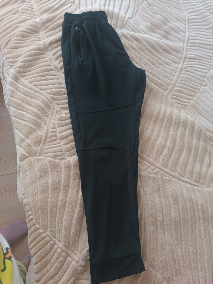 Siyah renkli, bol kesim ve fermuarlı ceplere sahip erkek eşofman altı. Sentetik kumaştan üretilmiş, günlük sokak stili için uygundur.