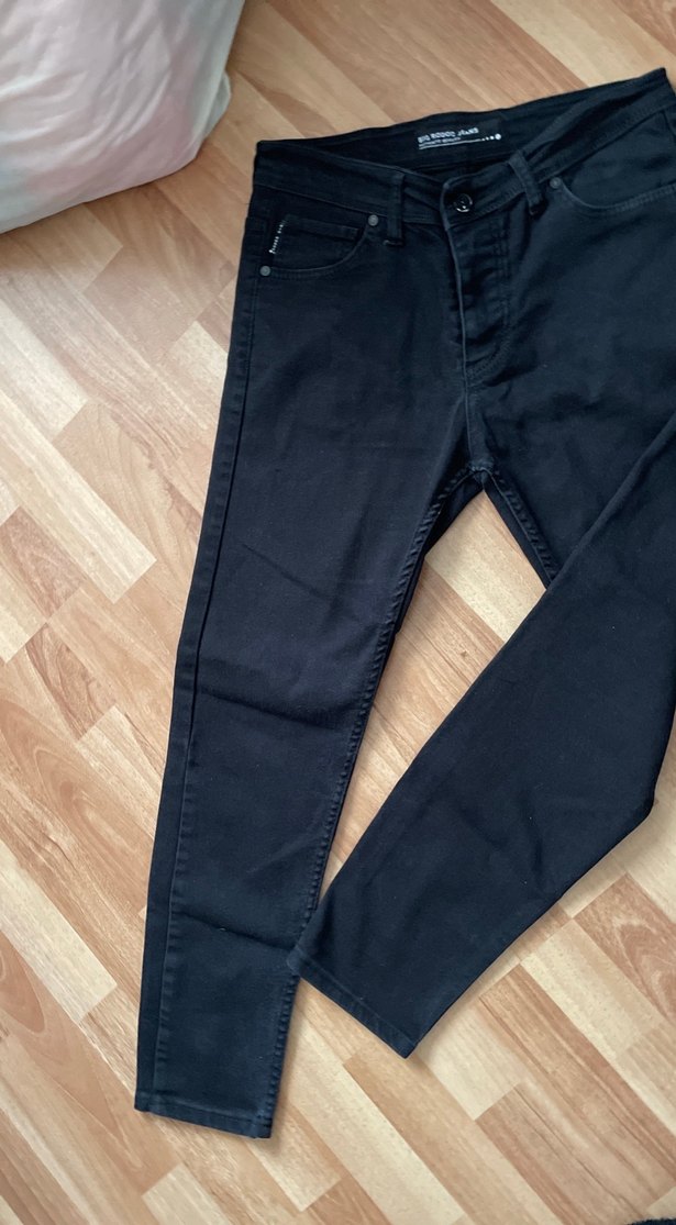 Erkekler için siyah denim jean, normal boy ve regular fit kesimle rahat ve şık bir görünüm sunar. Günlük kullanıma uygundur.
