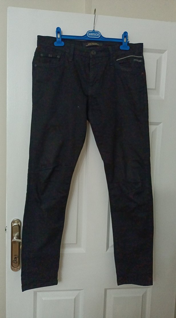 Siyah renk, regular fit kesim, denim kumaştan erkek pantolon, tokalı detaylı, günlük rahat kullanım için uygun.