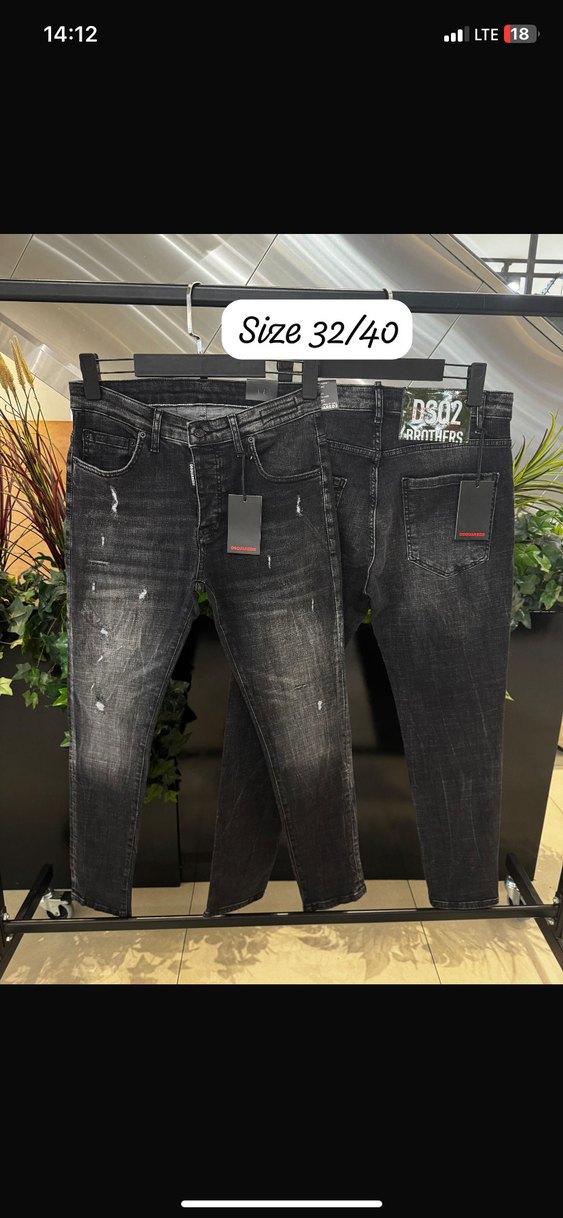Siyah kot pantolon, regular fit ve kısa boy, kemerli ve hafif batik desenlidir. Beden 32-34-36