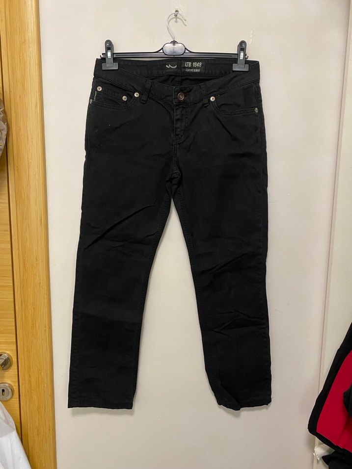 Beltli, midi boy, regular fit siyah kot pantolon. Günlük kullanıma uygun sade ve rahat kesim.