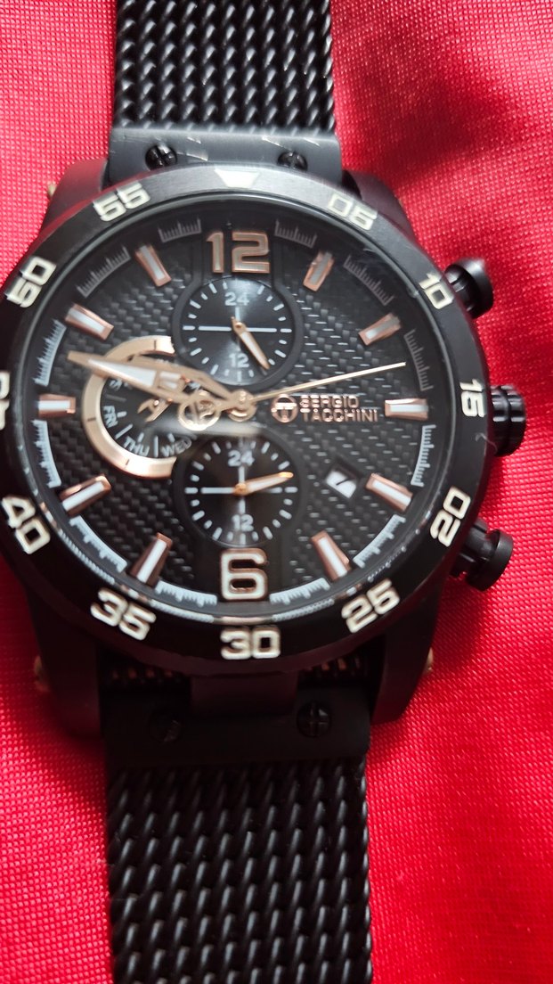 Erkek biker saat, siyah dokulu kadran ve renkli detaylarla. Üç alt kadran ve 12, 6, 9 rakamlı göstergeler içerir. Siyah file kayışlı. ⌚