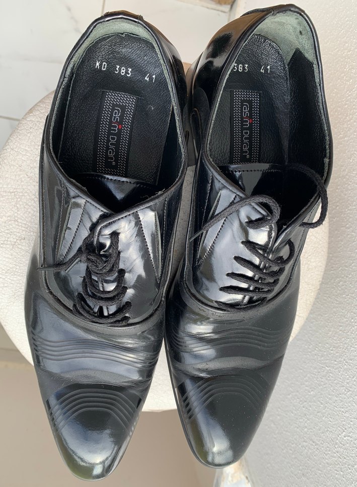 Siyah rugan ve parlak yüzeye sahip erkek klasik ayakkabı, iki kez giyildi. Rasim Duran’nın el işidir. Gıcır gıcır, 41 numara.Kösele taban. Yeni sahibine hayırlı olsun..
