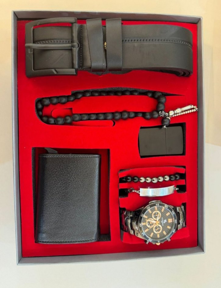 Siyah metal kayışlı erkek saat, deri kemer, cüzdan, boncuklu ve iki bileklikten oluşan set. İş ve sokak tarzına uygun. ⌚