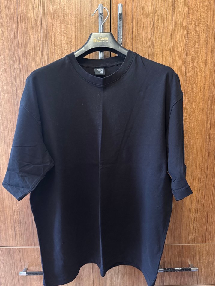 Siyah bisiklet yaka, kısa kollu ve salaş kesim, yumuşak sentetik kumaştan günlük rahat kullanım için uygun tişört.