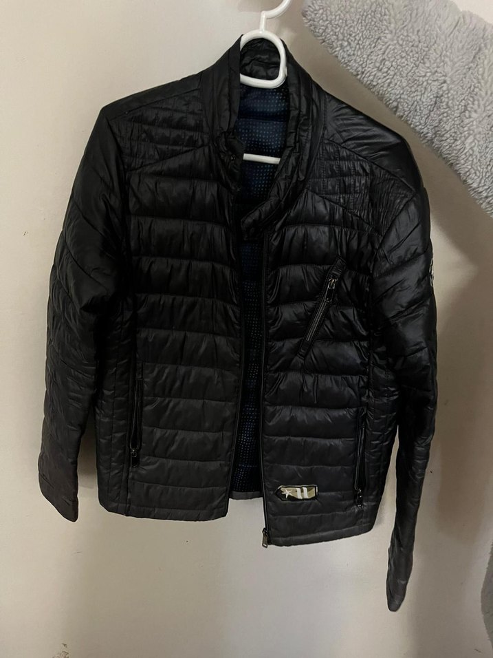 Fermuarlı, siyah şişme erkek mont, normal midi boyda, uzun kollu ve yakası keskin. Günlük sokak stili için uygun, şık ve sade.