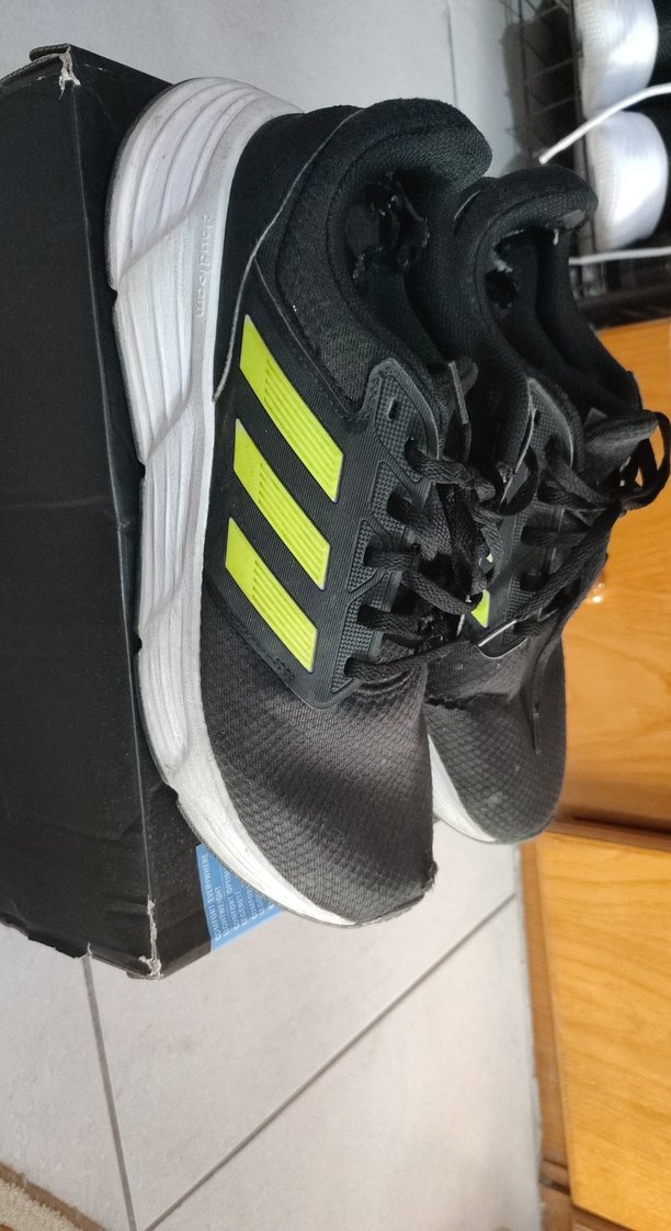 Siyah renkli,bağcıklı erkek spor ayakkabısı, baskılı tasarım ve kauçuk taban ile sokak stiline uygun. Deliği var. İç kısmında aşınmalar var görsele koydum. Orijinal adidas