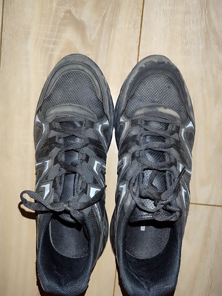 Erkek spor ayakkabılarında kullanılan siyah bağcıklar, sade ve işlevsel tasarıma sahip. siyah renk sadece tozlu bir kez giyildi