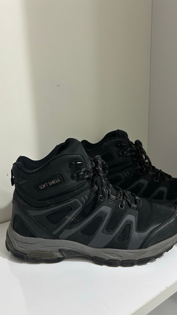 Siyah renkli, velcro bantlı ve yılan desenli erkek dış mekan spor botları, kauçuk tabanlıdır.
