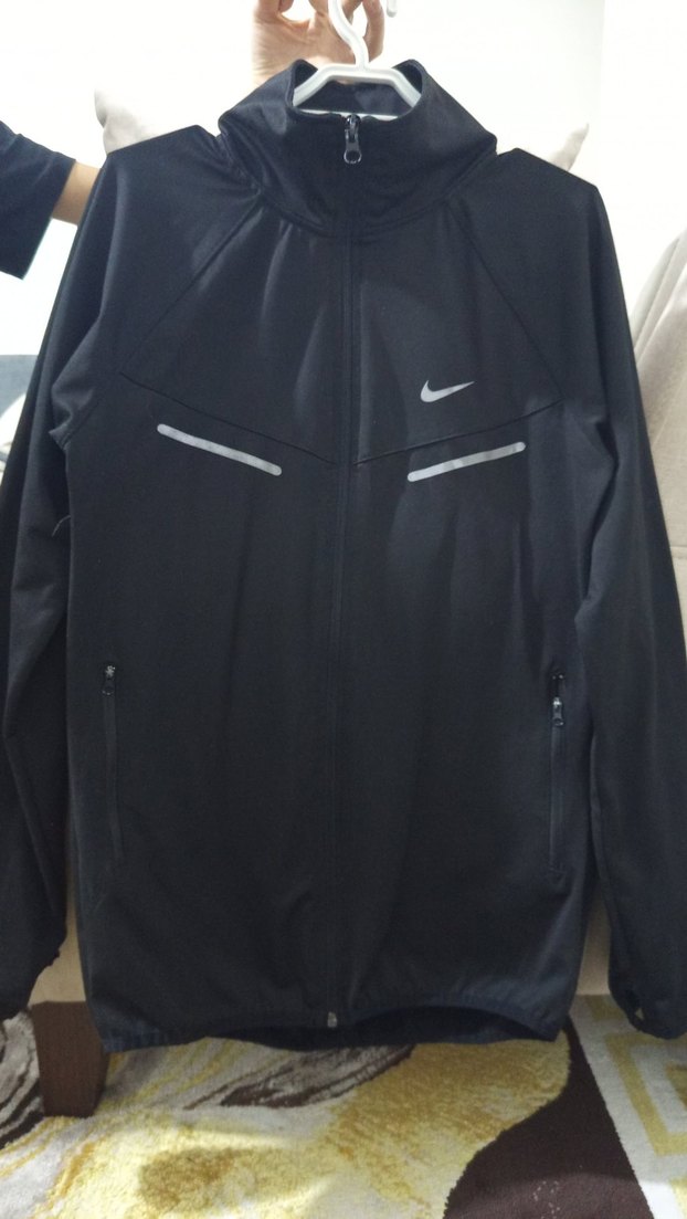 Erkek siyah yağmurluk, yüksek yakalı ve fermuarlı, uzun kollu, sentetik kumaştan, spor ve günlük kullanıma uygun.