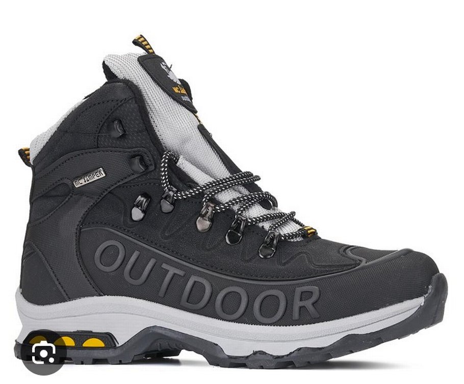 Erkekler için siyah kauçuk malzemeden yapılmış, gri yılan desenli ve bağcıklı outdoor bot. Sokak giyimi ve spor şıklığı için uygundur.