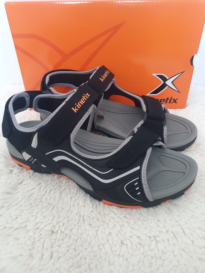 Gri ve siyah renklerde, baskılı desenli erkek spor sandalet. Ayarlanabilir velcro bantlarla rahat kullanım sağlar. Marka adı 'etix' görünür.