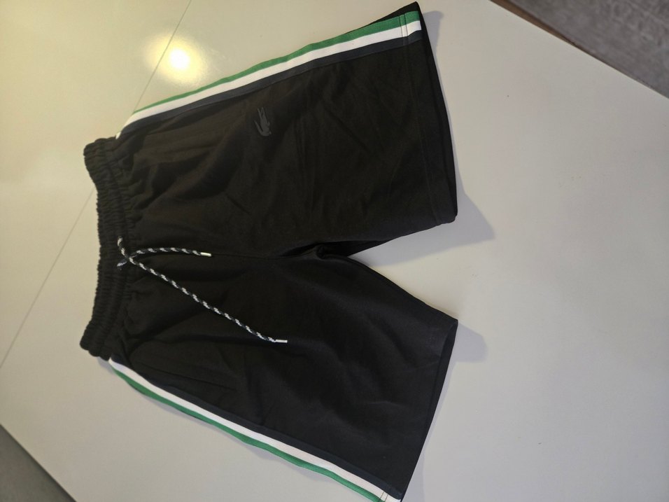 Fermuarlı detaylara sahip, yanları beyaz ve yeşil şeritli, siyah erkek spor şortu. Midi boy, sportif kullanım için uygundur.