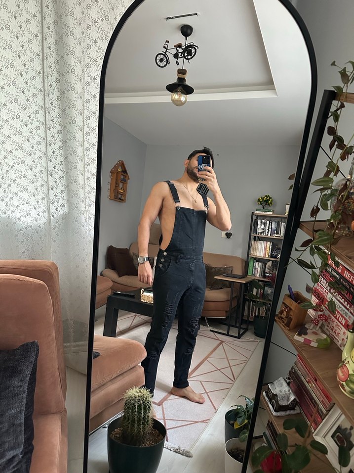 Siyah renkli, trendi sokak stiline uygun erkek askılı pantolon. Rahat kesimi ve koyu rengiyle dikkat çeker.