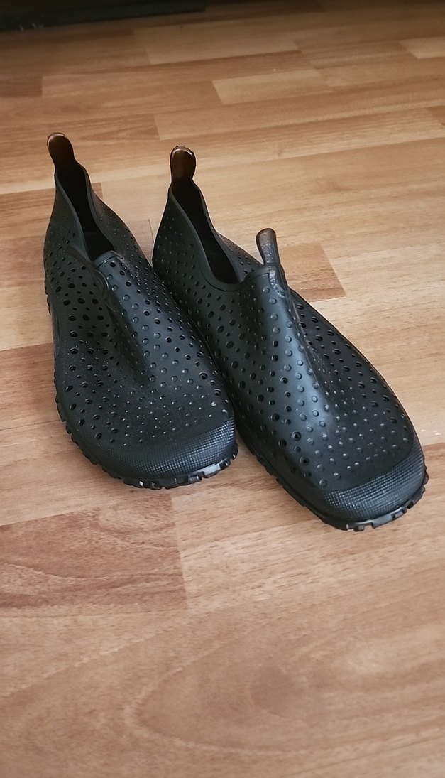 Siyah erkek su ayakkabısı, lastik malzemeden üretilmiş, nefes alabilir delikli tasarımıyla rahat ve şık bir görünüme sahiptir.