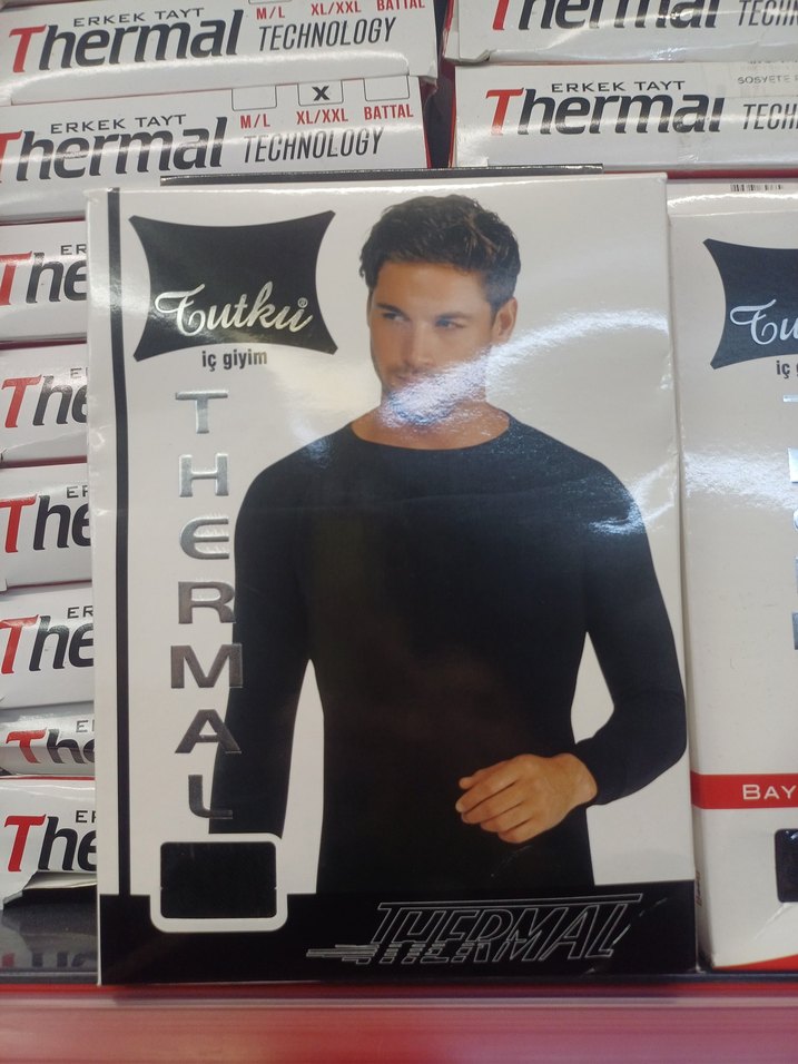 Dar kesim siyah erkek termal içlik, kısa boylu ve baskılı desene sahip, athleisure tarzına uygun ısı tutan teknoloji ile üretilmiştir.
