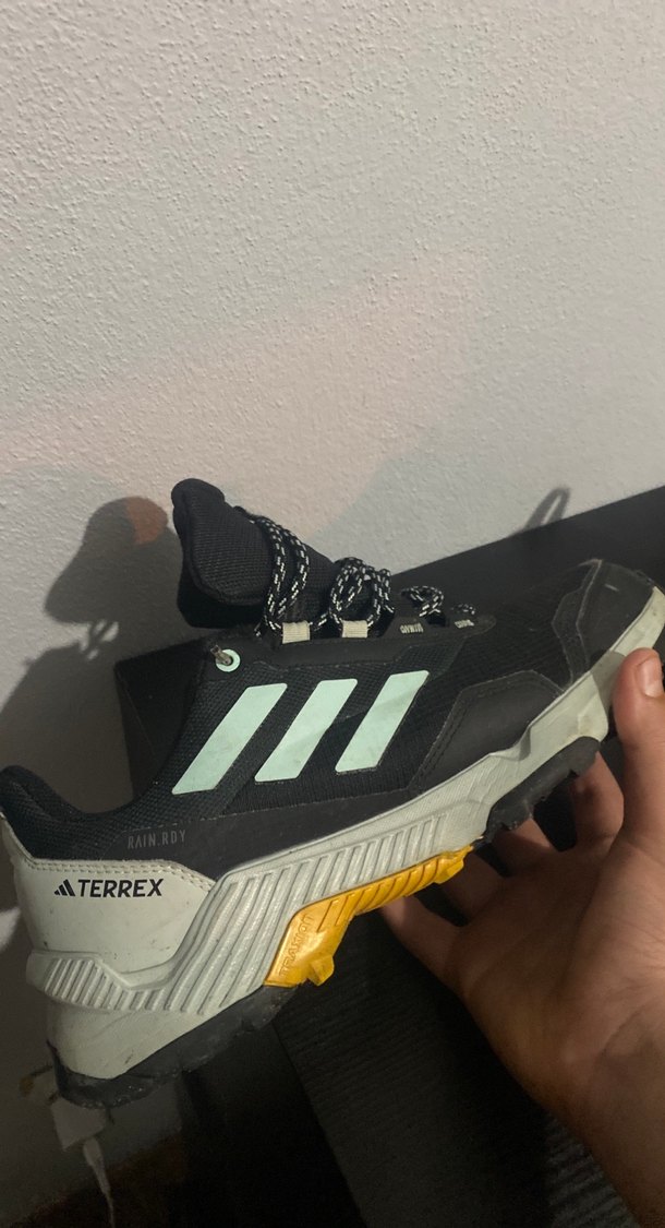 Erkekler için siyah outdoor ayakkabı, baskılı detaylar ve bağcıklı tasarıma sahip. Terrex markalı, spor ve sokak stili için uygun.