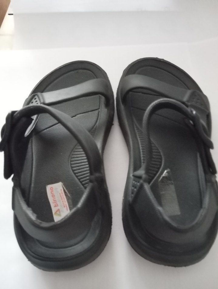 Siyah erkek sandalet, kauçuk malzemeden üretilmiş ve tokalı kayışa sahip. Minimalist ve sade tasarımlı, dış mekan kullanımı için uygun.