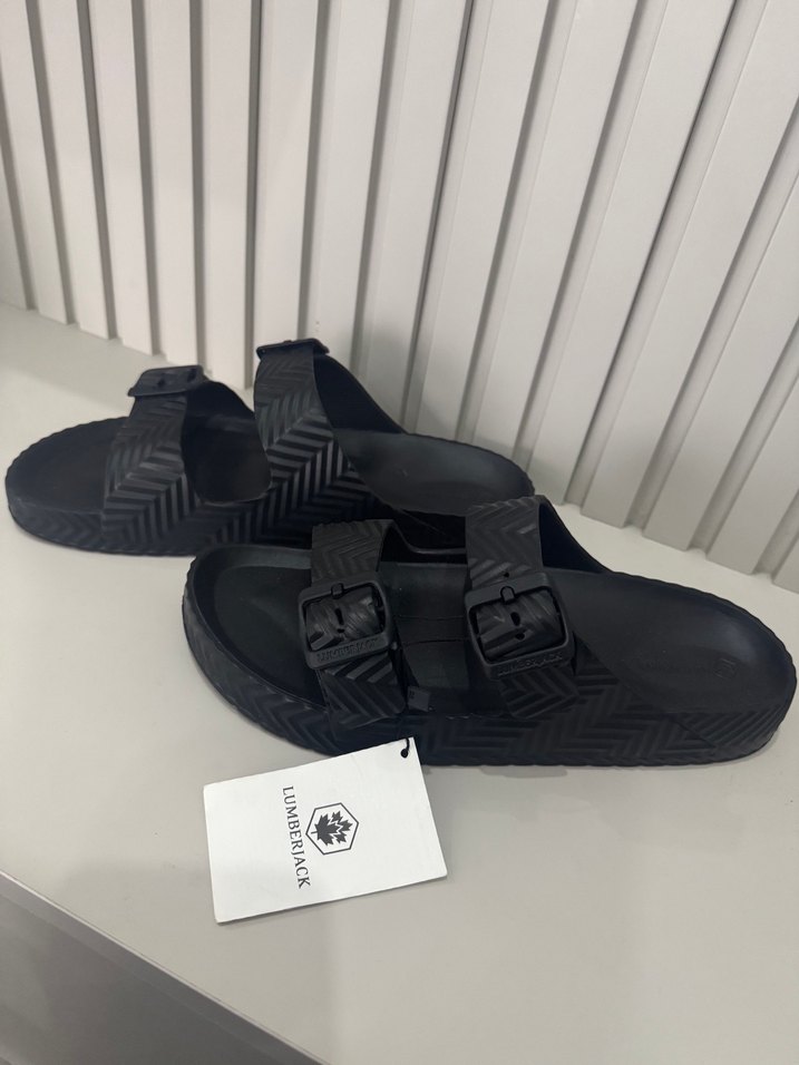 Erkekler için siyah kauçuk tabanlı, tokalı terlikler. Sokak modasına uygun, desen içermeyen şık ve dayanıklı tasarım. Lumbarjake terlik