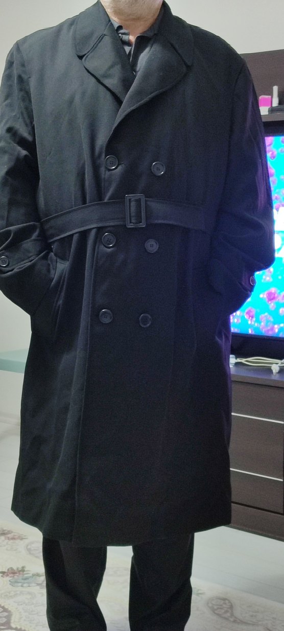 Siyah erkek uzun trençkot, kemerli bel ve kesimli yakaya sahiptir. Sentetik kumaştan üretilmiş, sarmal kollu ve günlük kullanıma uygundur.