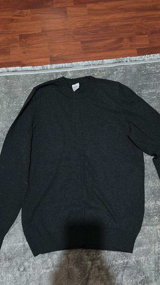 Siyah, uzun kollu, yuvarlak yakalı, bol kesim ve normal boyda, yumuşak ve sıcak kumaştan erkek kazak. Minimalist sokak stili için uygun