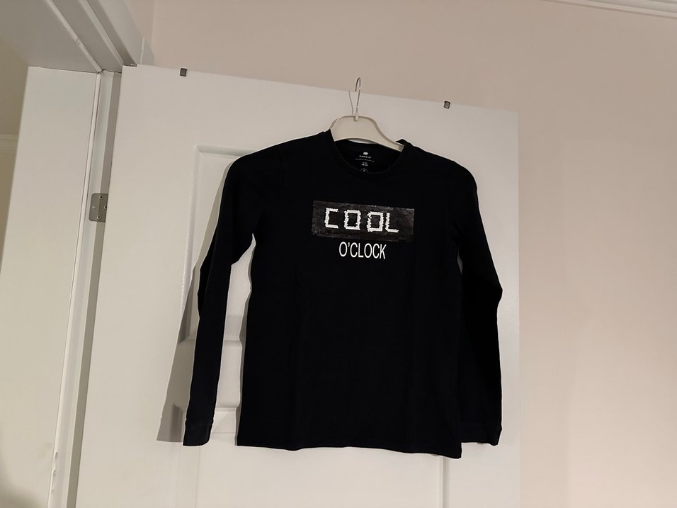 Pamuklu siyah uzun kollu, yuvarlak yakalı, bol kesim erkek sweatshirt. "COOL" ve "O'CLOCK" baskılı, rahat ve şık bir sokak stili sunar.