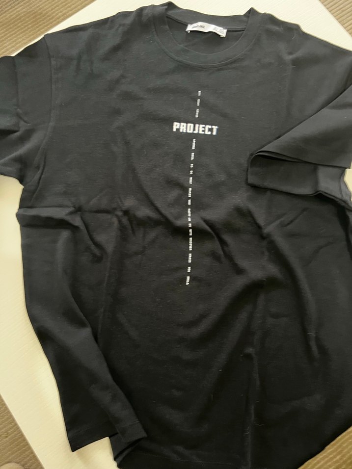 Siyah, uzun kollu, yuvarlak yaka, bol kesim ve dikey 'PROJECT' baskılı, pamuk kumaştan üretilmiş sokak stili tişört.